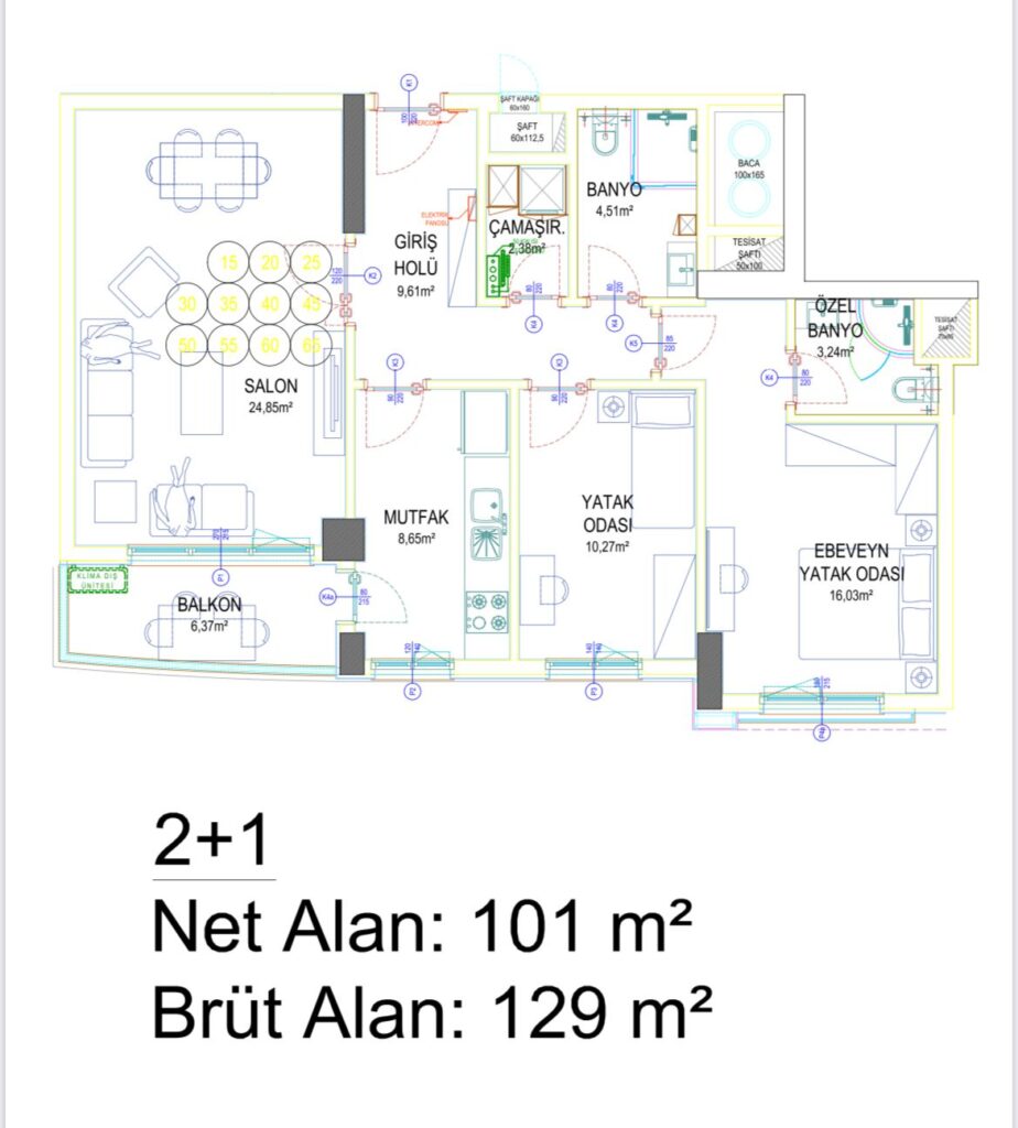The project has 220 apartments in four 15-decker apartment blocks, the apartment sizes range from 135 m2 to 189 m2; 2 + 1, 3 + 1 and 4 + 1 meet all needs with different housing types.