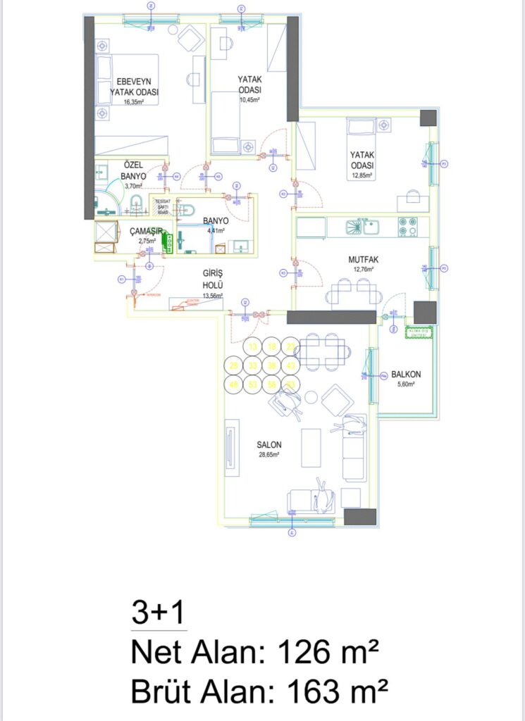 The apartment is located in Bahçeşehir. This flat in that project awaits you to give the best experiences with its social and entertainment opportunities. These opportunities are 24/7 security services, restaurants, cafes, basketball and football courts, picnic areas, playgrounds for children, steam rooms, sauna, spa and fitness centers.